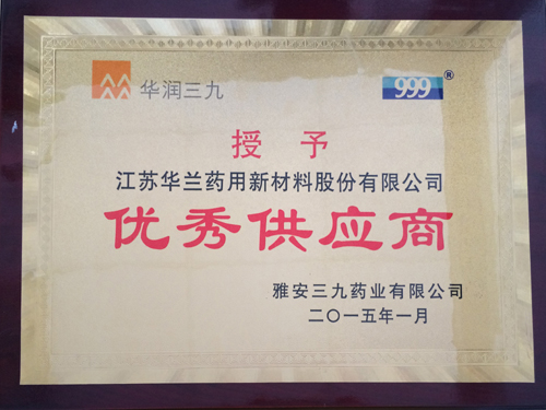2015年1月,公司凭借优质的产品,及时的交货,良好高效的服务等优势被雅安三九药业评为2014年度优秀供应商。