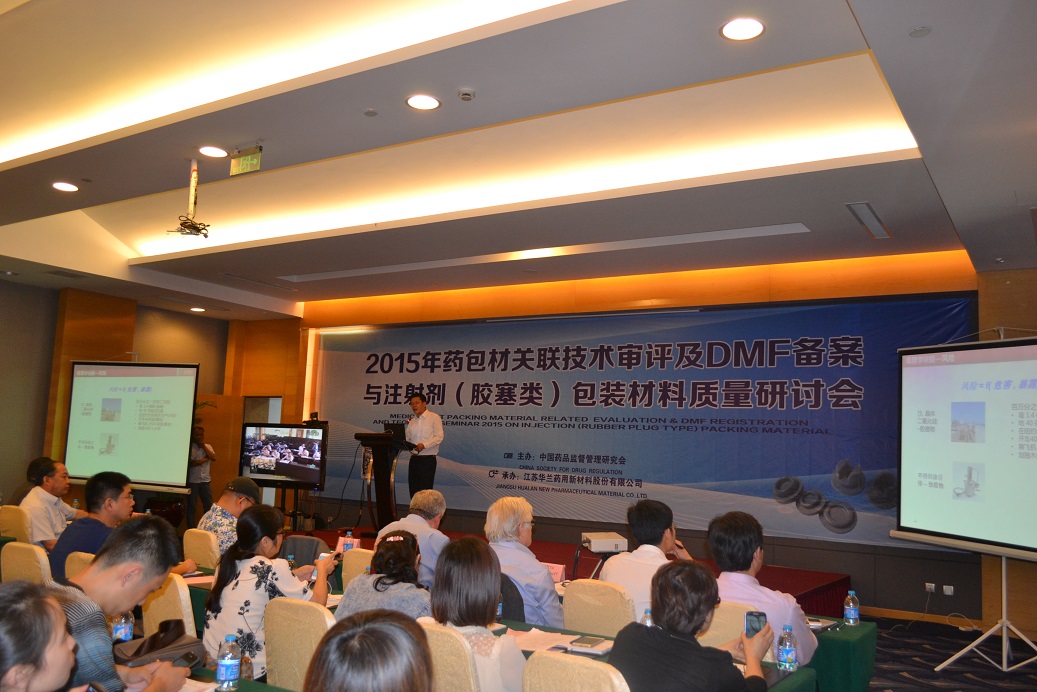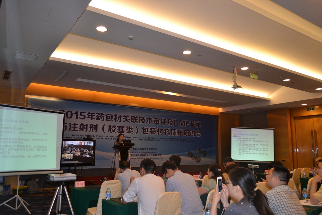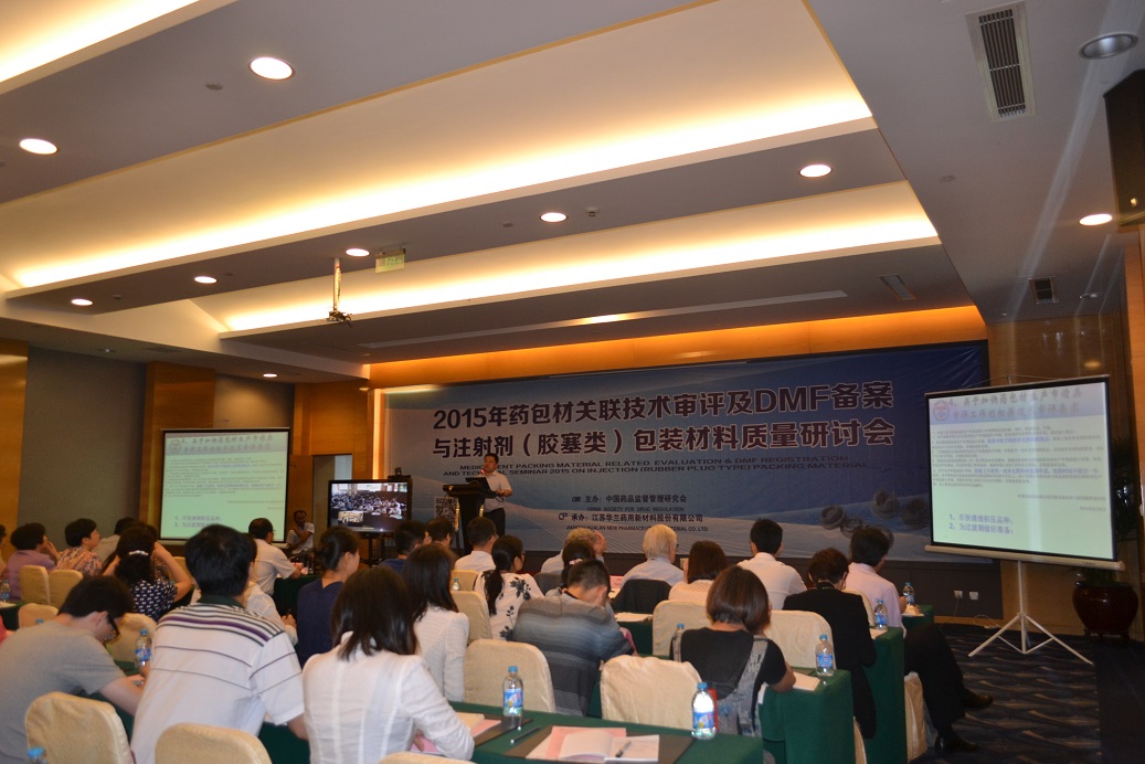 6月23日,由中国药品监督管理研究会主办、我公司承办的2015药包材关联技术审评及DMF备案与注射剂(胶塞类)包装材料质量研讨会在常州维景国际大酒店召开。中国药品监督管理研究会、中检院包装材料与药用辅料检定所、国家食品药品监督管理局药品包装材料科研检验中心、浙江省食品药品检验研究院包装材料检验所、无锡市食品药品监督管理局专家领导及来自全国各地的150余名制药界代表参加了此次会议。